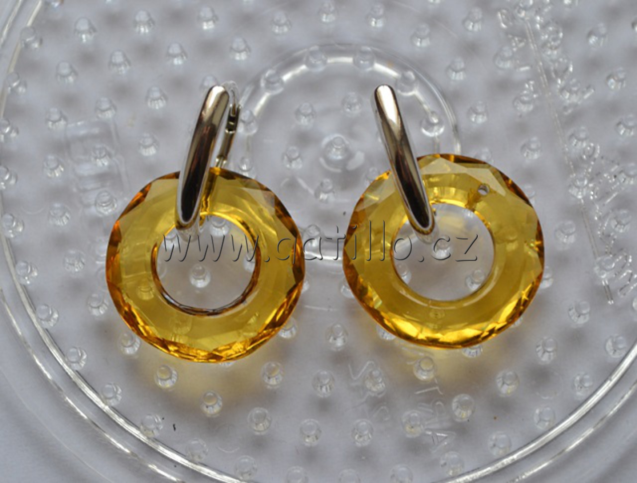 Náušnice s broušenými kruhy ze starého jabloneckého skla, zavěšené na stříbrném anglickém háčku označeném ryzostním číslem. Průměr kamene cca 15 mm. Materiál zapínání AG925/1000.