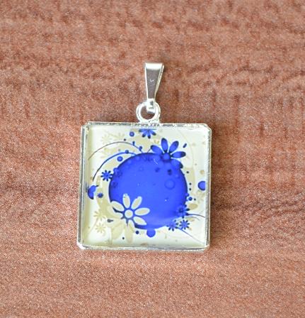 Bižu přívěs ve stříbrné barvě s béžovo-modrou zeměkoulí, zalitý křišťálovou pryskyřicí. Velikost cca 18 x 18 mm.