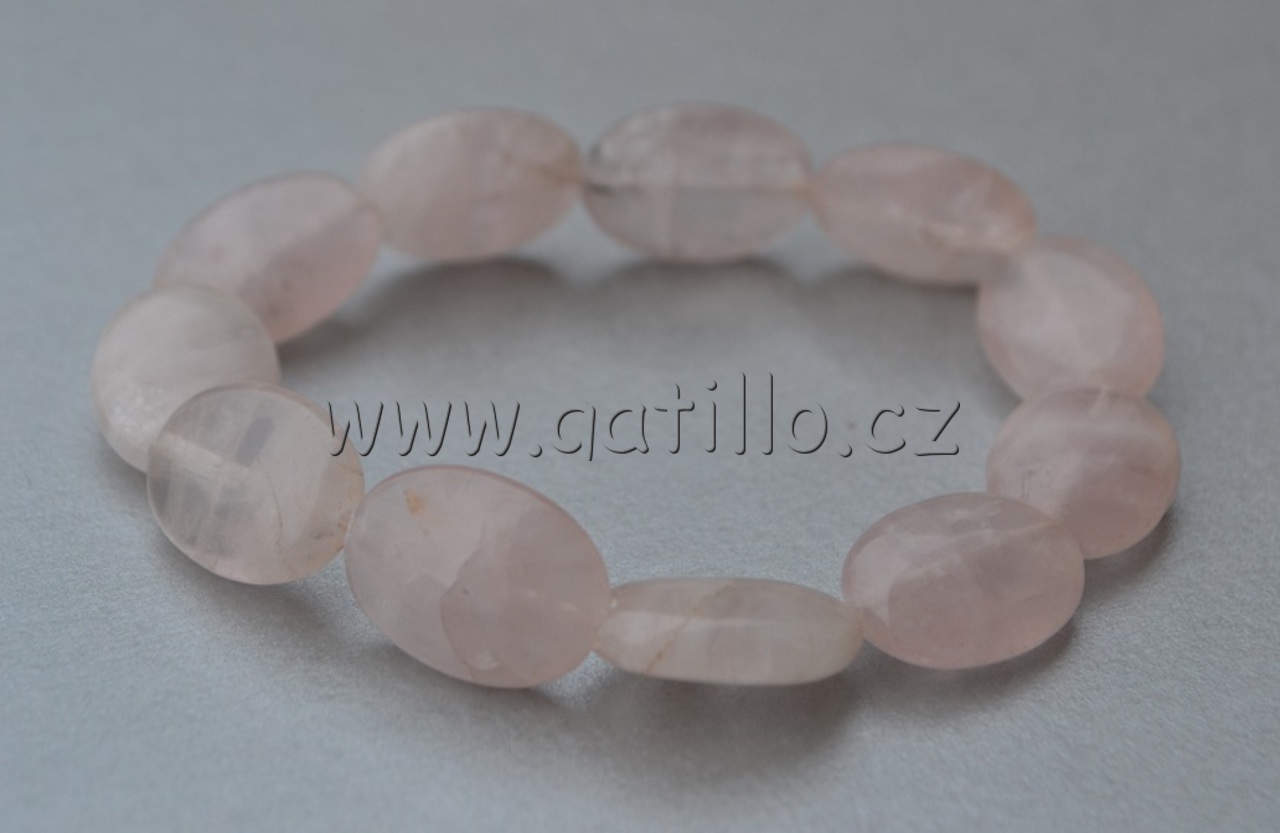 Náramek s oválky z růženínu na pružence - variabilní velikost. Kámen cca 13x18 mm, 10 ks. Poškozený kámen, II. jakost, foto pouze ilustrační.