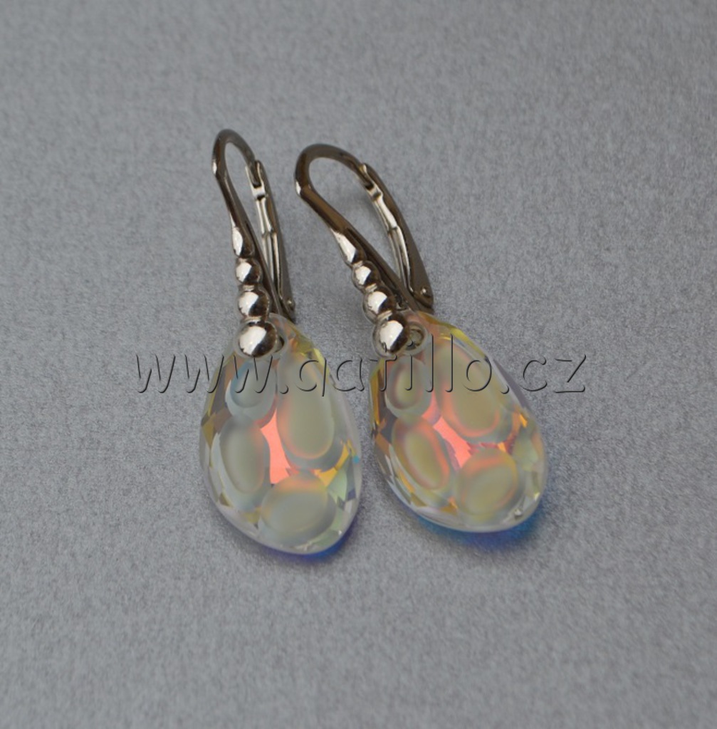 Náušnice Radiolarian Made with Swarovski® Crystals v odstínu Crystal Aurore Boreale zavěšené na zdobeném stříbrném anglickém háčku označeném ryzostním číslem. Velikost kamene 18x11 mm.