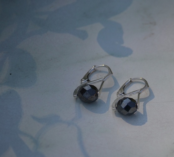 Náušnice s ploškovanými kuličkami hematitu, zavěšené na stříbrném anglickém háčku označeném ryzostním číslem. Průměr kuličky 8 mm.