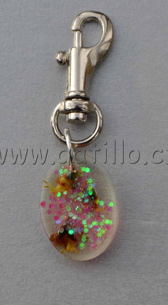 Bižu přívěs na klíče s květinami a třpytkami, zalitou v křišťálové pryskyřici. Celková délka 62 mm, rozměr 25x18 mm. Karabina z obecného kovu.